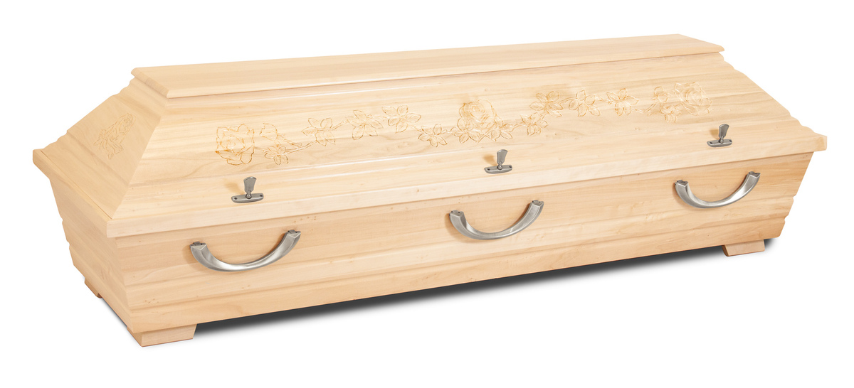 Naturfarbener Sarg aus Pappelholz mit dezenter Rosenprägung und sechs Griffen aus Edelstahl. Schlicht, hell und würdevoll gestaltet.