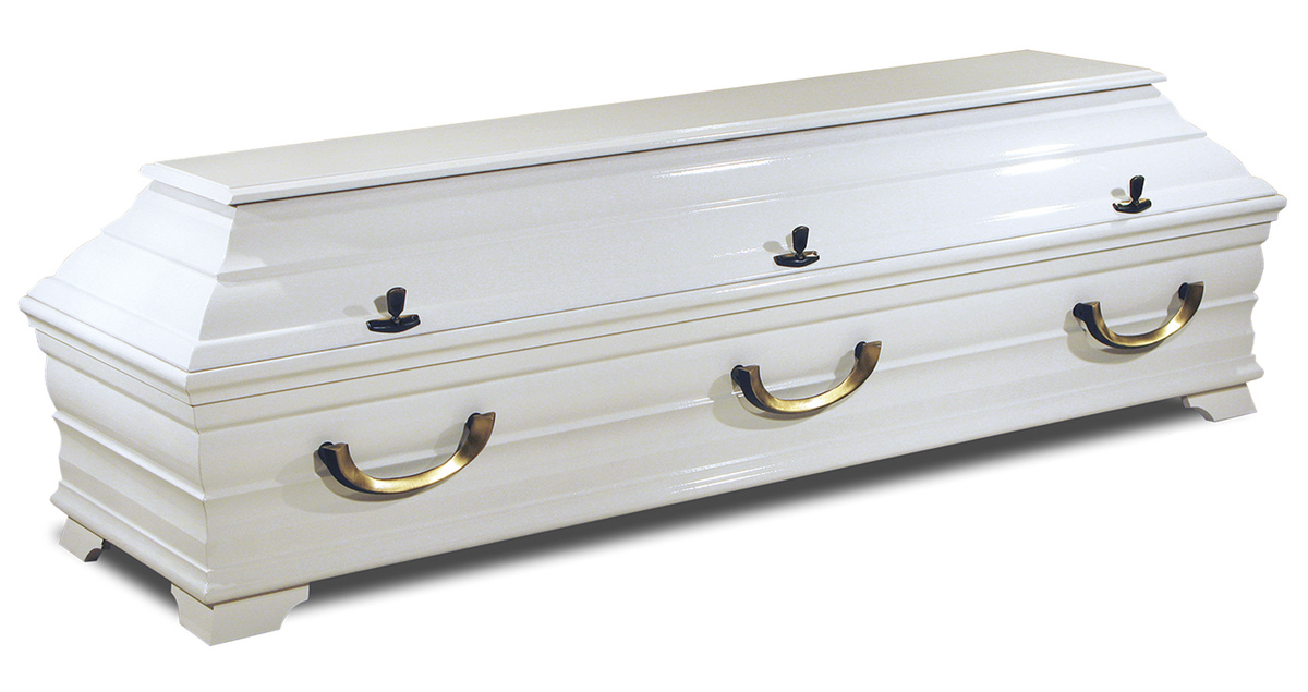 Weiß hochglänzend gefasster Sarg aus Kiefernholz mit sechs messingfarbenen Metallgriffen. Klar, klassisch und ruhig im Ausdruck.