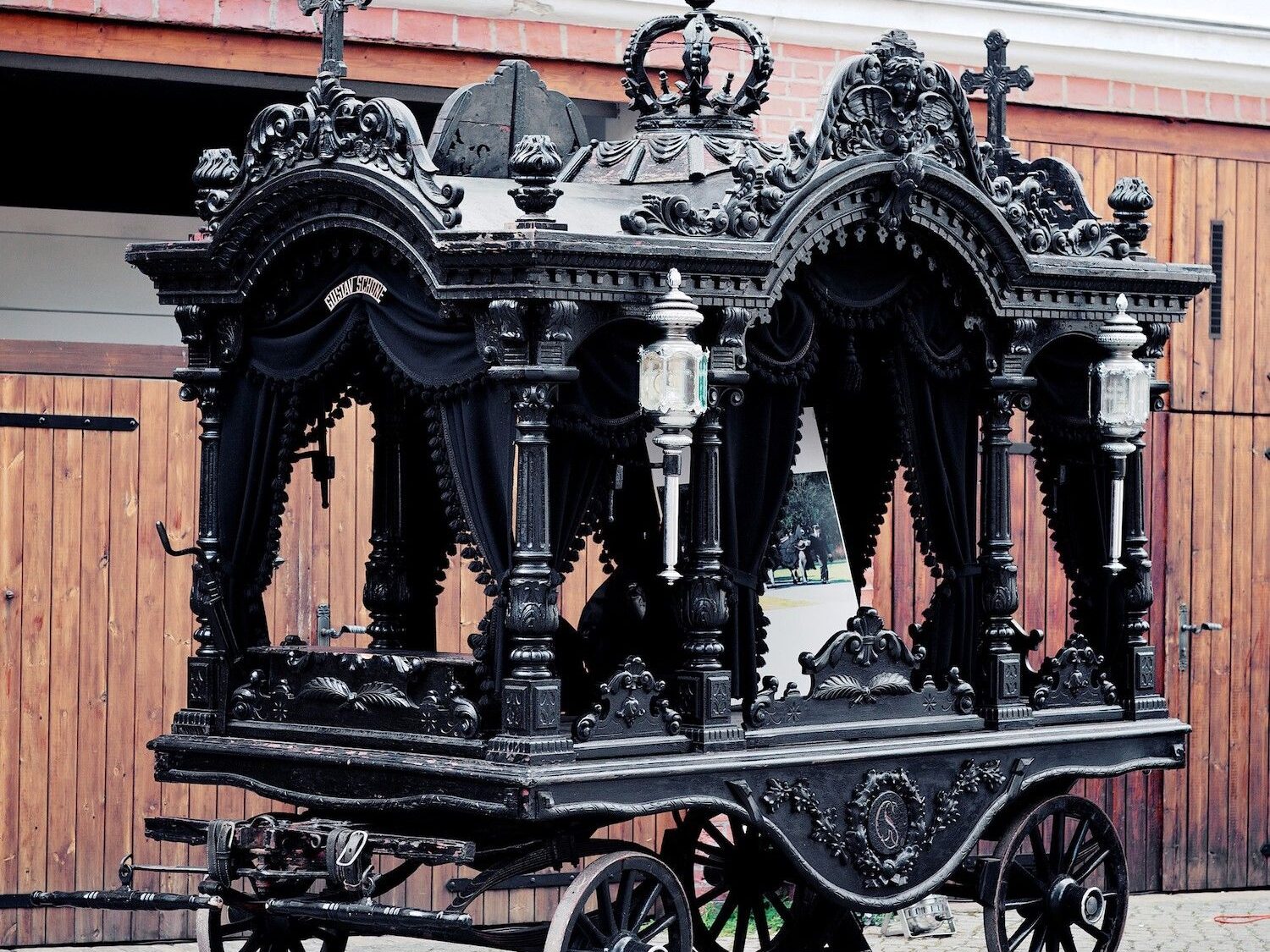Ein wahres Schmuckstück des Bestattungsfuhrwesens ist dieser historische Wagen aus handgeschnitzter Eiche. Baujahr ca. 1850.
